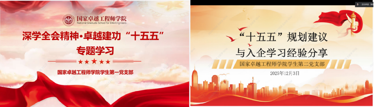 活动中,学生第一党支部书记刘一苏、学生第二党支部书记张骐分别带领学生党员深入学习《中共中央关于制定国民经济和社会发展第十五个五年规划的建议》,系统解读国家在科技创新、产业升级、人才培养等方面的战略布局。刘一苏表示,卓越工程师是国家战略人才力量的重要组成部分,必须将个人成长融入国家发展大局,在新时代新征程中勇担重任、奋发有为。张骐表示,党员同志应深入理解“十五五”规划的意义,以此为指导明确个人发展方向,在解决真问题、锤炼真本领方面发挥党员先锋模范作用。随后,全体成员观看了“十五五”规划解读视频,系统学习了其在科技创新、产业升级等领域的战略部署。