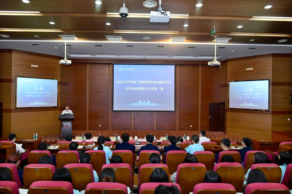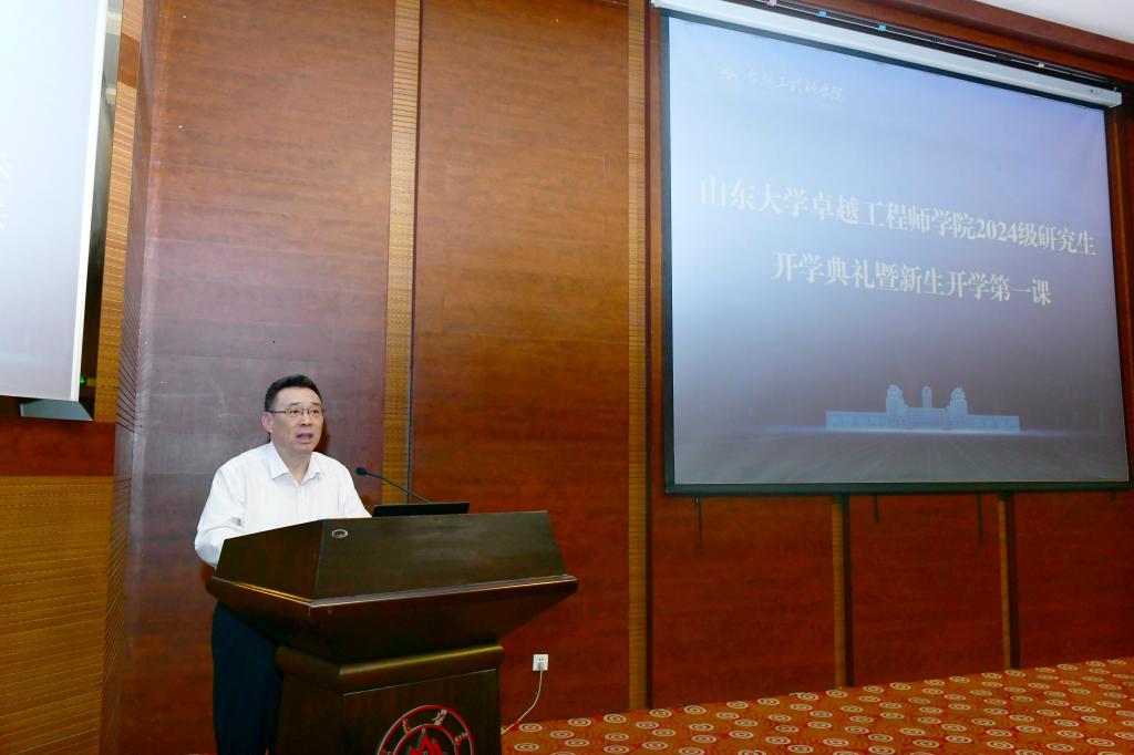 随后,吴臻为新生讲授了题为《心怀“国之大者”,努力成为担当民族复兴大任的卓越工程师》的“开学第一课”。他带领新生纵览山大的悠久历史和学科建设、平台建设、人才队伍建设成就,站在全球视野与理论高度阐明了我国卓越工程师培养面临的挑战,深度解析了威廉官网中国卓越工程师培养的特色与成效。他提出,爱党报国、敬业奉献是卓越工程人才必须具备的品格素质,具有突出技术创新能力、善于解决复杂工程问题是卓越工程师能力培养核心要求。威廉官网中国卓越工程师学院积极推进工程硕博士培养改革工作,在探索有组织育人中形成了党建引领、项目牵引、工学交替、分类评价、国际交流五大培养特色,形成了具有山大特色卓越工程师培养新模式。最后,他希望每一位同学都能“把论文写在祖国大地上”,立志科研报国,善于提出问题,注重交叉融合,坚持久久为功,努力成长为党和国家所需要的工程科技领军人才,为中国式现代化建设奉献青春的智慧和力量。