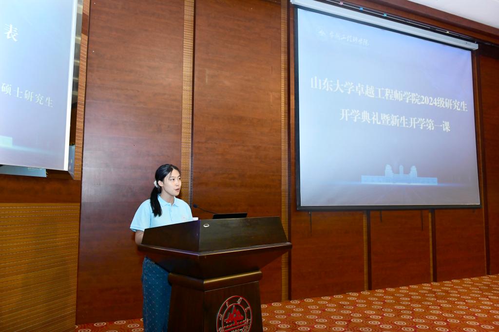 卓越工程师学院2024级硕士研究生,来自青岛校区的杨茜云代表新生发言。她结合参加山大-华为校企合作项目的经历,分享了对于“学与用”的认识,强调了实践的重要性。她立志要以王小云院士为榜样,追求卓越,超越自我,努力做国家网络安全的坚定守护者。