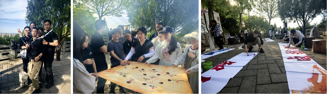 活动还设置三个游戏环节,“卓越圈”游戏,小组成员将A4纸撕成闭合纸环,全员依次穿过纸环完成挑战,考验动手能力与团队配合。“卓越团队重走长征路”,小组成员通过协作调整路线,使小球从长征路线地图的起点抵达终点,高度配合提升团队默契。最后全体师生共同绘制“纳斯卡巨画”,以艺术共创形式凝聚集体智慧,留下独特的活动纪念,传递着追求卓越、科研报国的精神。