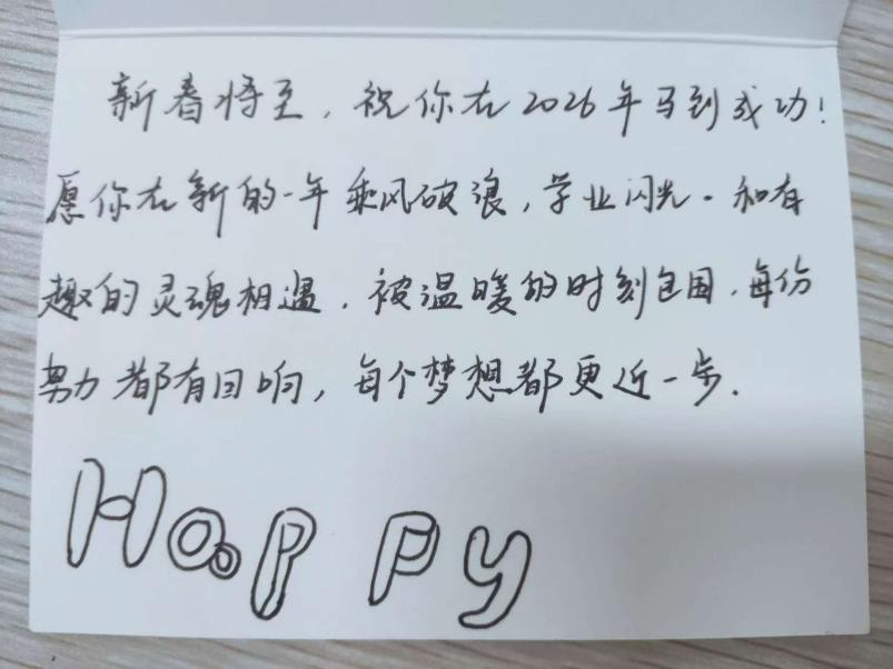 在匿名互赠祝福环节,同学们以笔墨寄情,认真在卡片上写下对同窗的新年祝愿。随着随机抽取环节的进行,一份份来自未知的惊喜被开启:字里行间,或有对科研顺利的鼓励,或有对生活顺遂的期许,温暖的文字寄托着最美好的祝愿。借此活动,也提前祝国卓院全体师生新的一年喜乐顺遂。